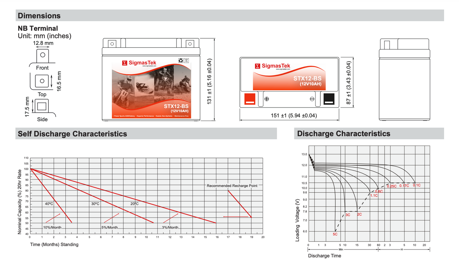 Built to resist freeze, heat, and vibration, this battery sustains performance through tough conditions and rugged roads. Whether your application is motorcycle starting, emergency backup, or powering auxiliary systems, this long-lasting battery is up to the task. Its nut & bolt terminal design ensures secure connections, and the 12 Volt 10 Ah capacity balances compact size with dependable energy storage.