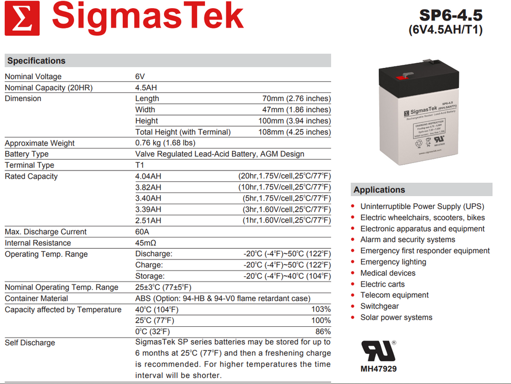 - Product listing identifier: SigmasTek6 Volts4.5 AHF1APC RBC15